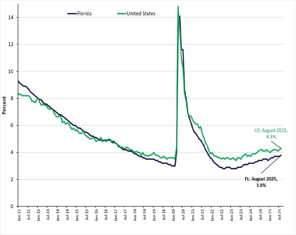 - Florida’s seasonally adjusted unemployment rate as of August, 2025, was 3.8%, which is 0.5% below the U.S. rate of 4.3%.