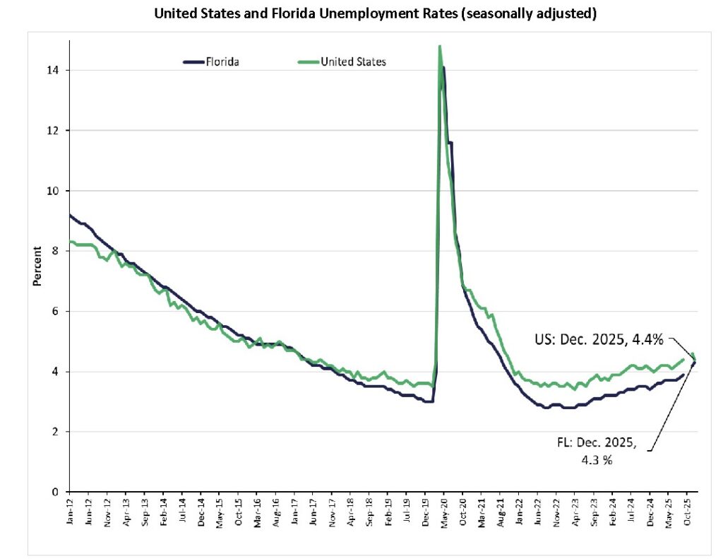 - Florida’s seasonally adjusted unemployment rate as of December, 2025, was 4.3%, which is 0.1% below the U.S. rate of 4.4%.