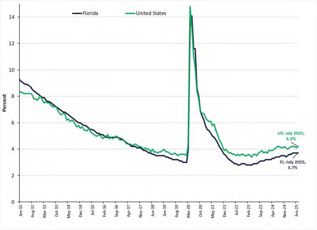 • Florida’s seasonally adjusted unemployment rate as of July, 2025, was 3.7%, which is 0.5% below the U.S. rate of 4.2%.
